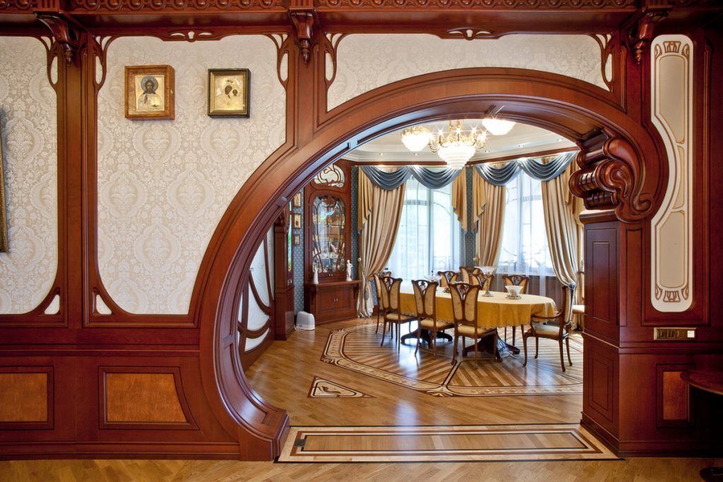 Интересно, что арки разделяют на пассивные (они простые по форме) и активные (сложной конфигурации). Арки могут быть прямыми и круглыми. Чаще всего встречаются в интерьере классические арки, которые украшали дворцы. Но в современных квартирах классические арки выглядят тяжеловато, так как закрывают световой поток и зрительно снижают высоту проема. Однако можно постараться подобную конструкцию сделать более невесомой. Для этого делают узорчатую классическую арку с помощью сквозных отверстий разнообразной конфигурации, которые позволяют сделать воздушным помещение, наполненным светом.